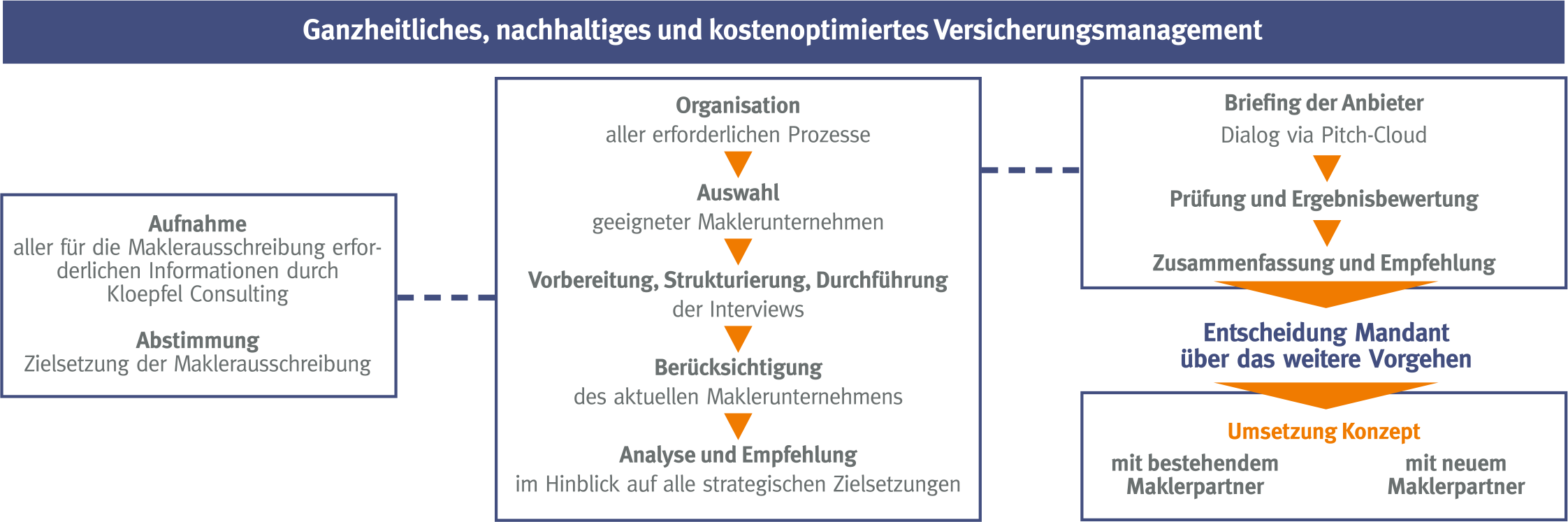 • Wir übernehmen die Koordination kompletter Maklerausschreibungen, kümmern uns um eine ganzheitlich ausgerichtete Risiko-Kosten-Optimierung und entwickeln innovative Konzepte für ein langfristig erfolgreiches Versicherungsmanagement
