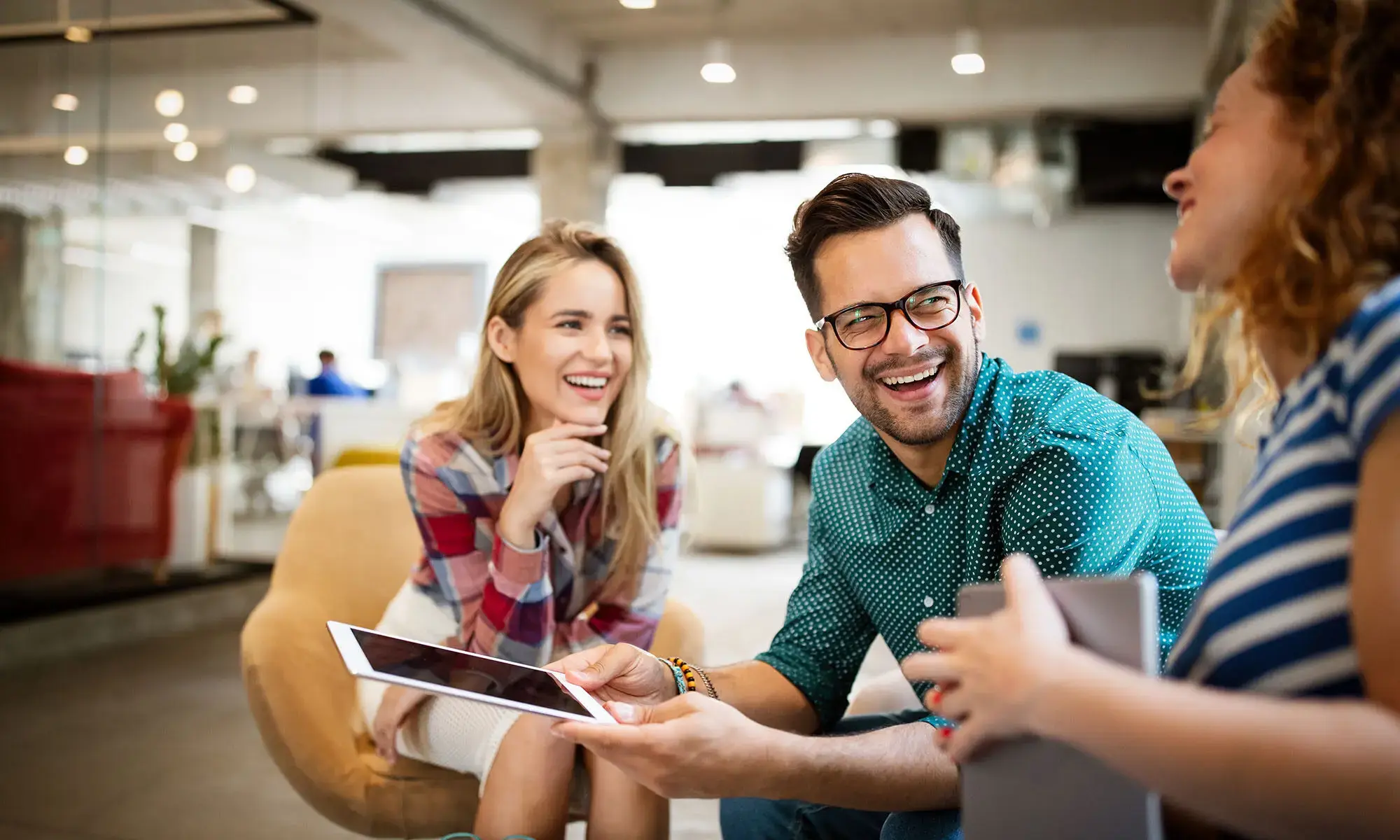 Drei Personen in einem modernen Büro, die miteinander sprechen und ein Tablet benutzen.